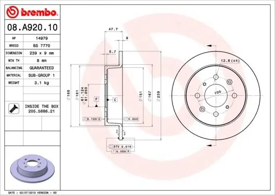 - BREMBO 08.A920.10 подходит к маркам/моделям авто: