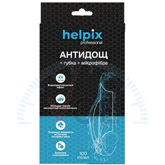 Антидождь Helpix Professional – это средство для обработки автомобильного стекла, которое образует на поверхности тонкую, прозрачную пленку, заполняющую мельчайшие неровности, что способствует быстрому отталкиванию воды (гидрофобизация поверхности) и обеспечивает отличную видимость для максимальной безопасности при сложных погодных условиях (дождь, ледяной дождь).