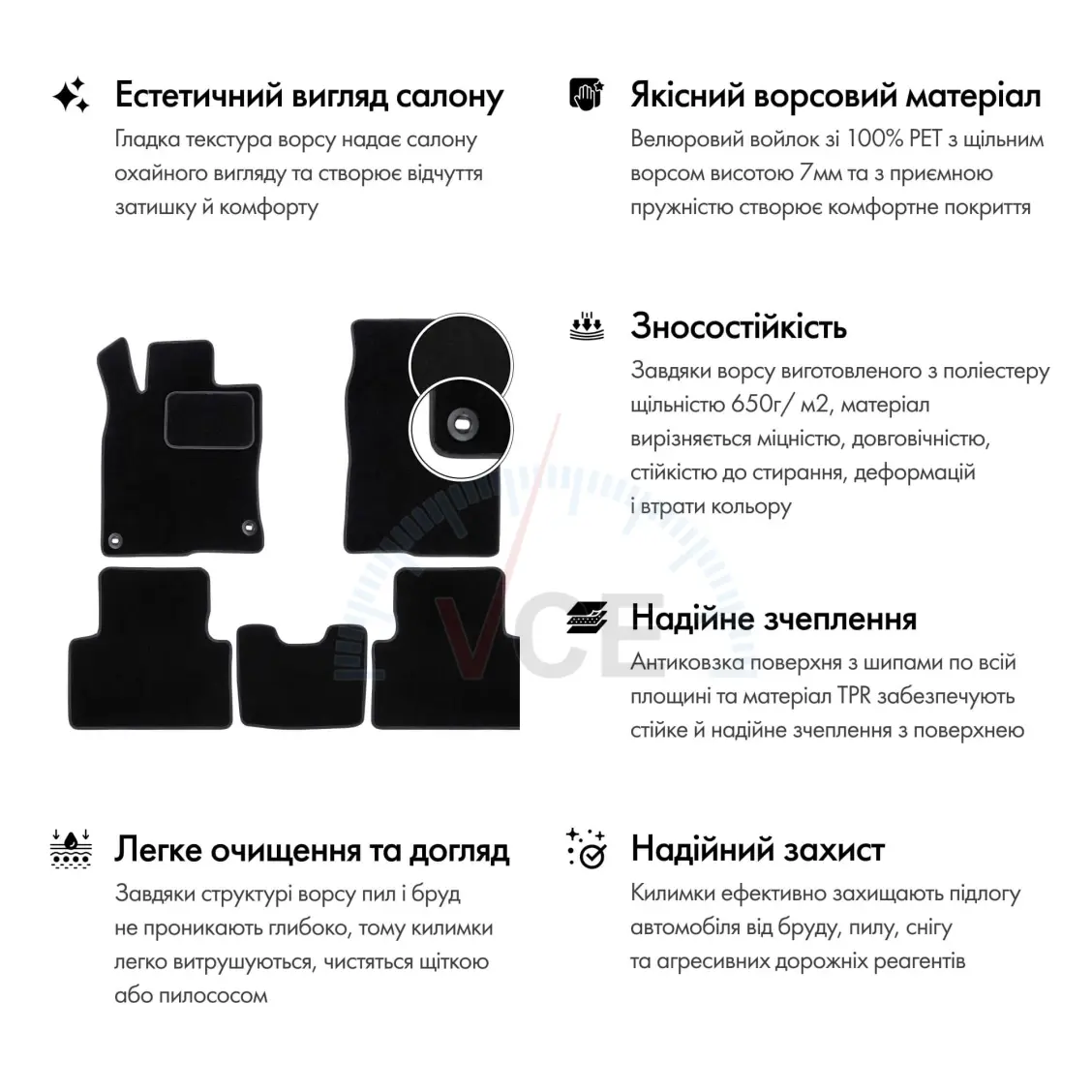 Специальное антискользящее TPR-основа с шипами по всей плоскости гарантирует надежное сцепление ворсовых ковриков с покрытием салона. Никакого сдвига или скольжения – только уверенная фиксация. - ✅ Легкий уход