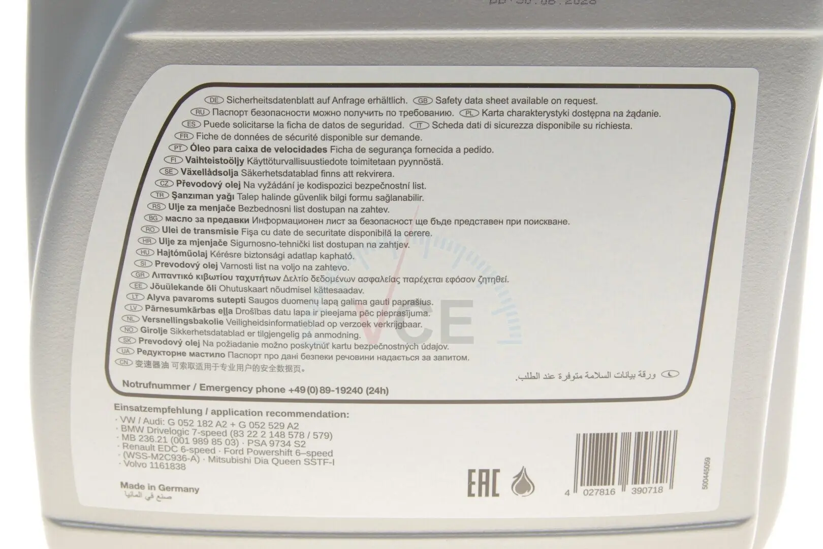 Специфікація OEM: BMW 83 22 0 440 214, BMW 83 22 2 147 477, BMW 83 22 2 148 578, BMW 83 22 2 148 579, BMW DCTF-1, BMW MTF LT-5, Ford WSS-M2C 936-A, MB 236.21, MB 236.24, Porsche 999 917 080 00, Porsche FFL-3, PSA 9734S2, SSTF-I, VW G 052 182, VW G 052 529